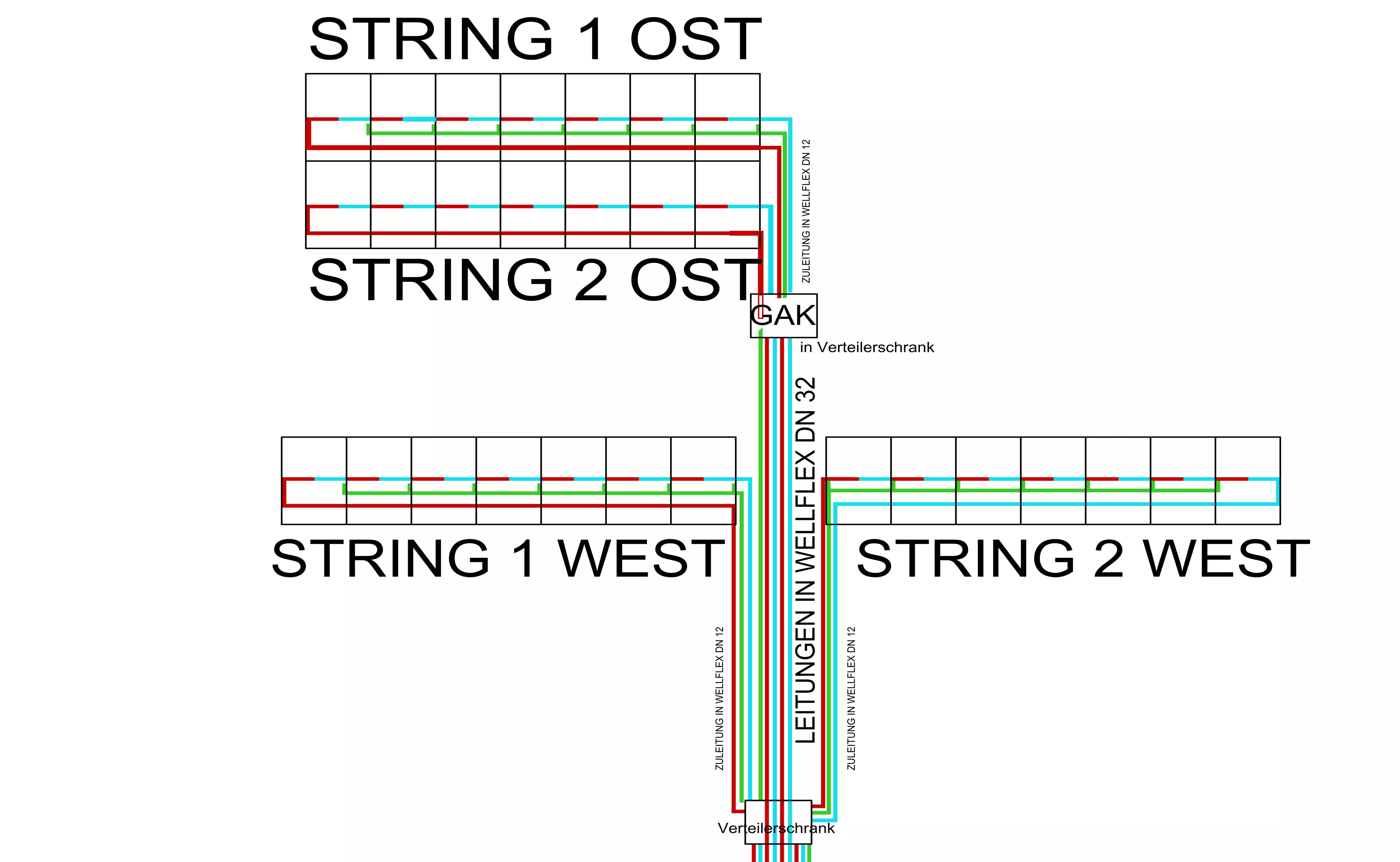 Anhand der Naturmaße, mit PV-Modulplan und dem Stringplan wird der Leitungs- und Montageplan für die Stringführung mit der Platzierung der Generatoranschlusskästen erstellt.