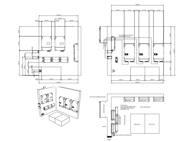 Auch die Platzierung der Wechselrichter, Speicher und gegebenfalles der MPPT Tracker soll nicht vergessen werden (dies ist bei bestimmten Anlagen manchmal eine Herausforderung)!